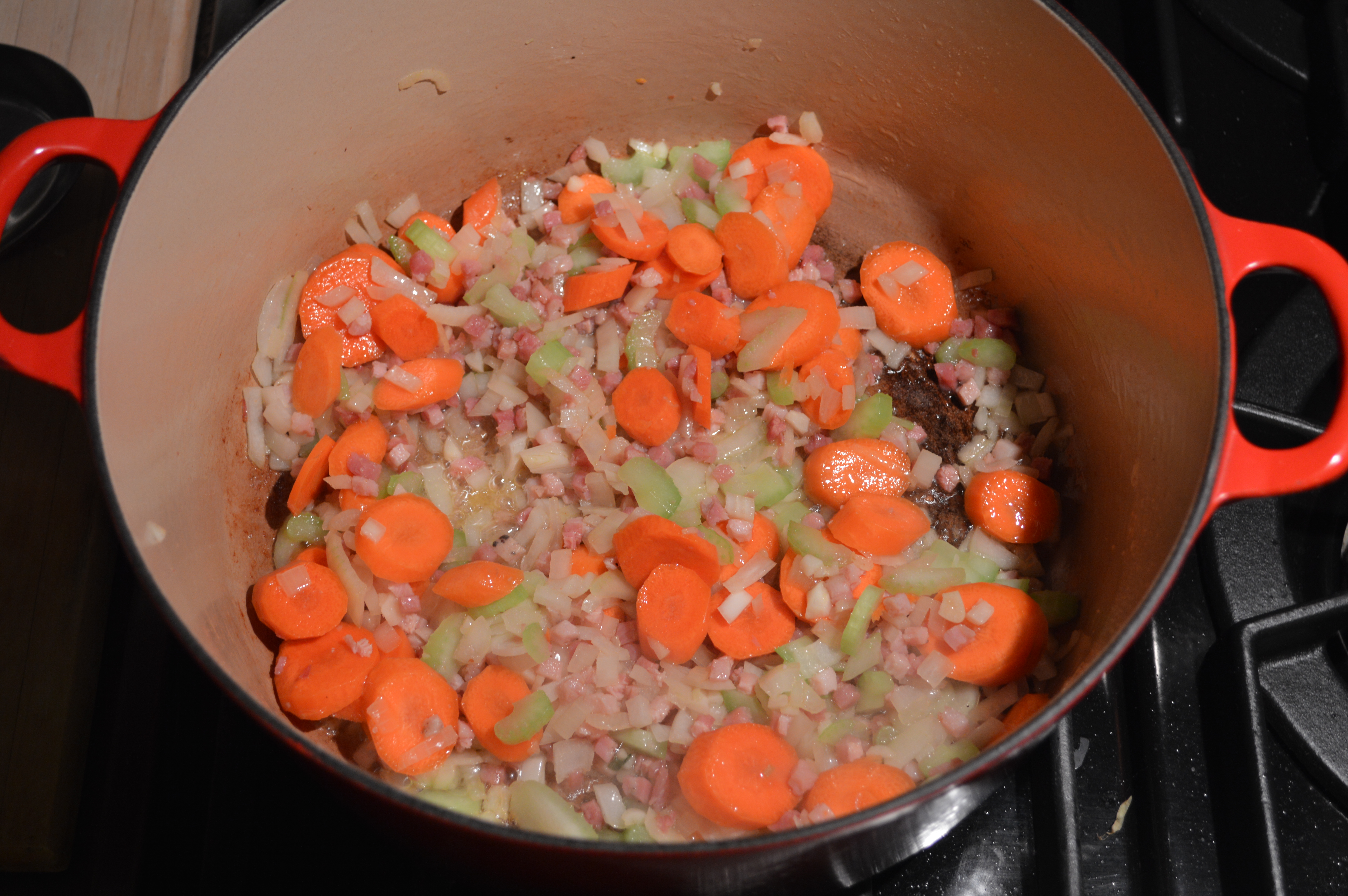 In large soup pot sauté pancetta in olive oil for several minutes, add onion, garlic, celery, and carrots sauté several minutes more. Add broth and everything else. Bring to boil, cover and lower heat to simmer till lentils are tender. (Approximately 1/2 hour)
